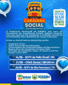 A Prefeitura de Solidão, por meio da Secretaria de Assistência Social, realizará neste mês de agosto mais uma edição da “Caravana Social – Bem pertinho de você!”, com o objetivo de descentralizar e facilitar o acesso da população a serviços essenciais de cidadania e inclusão social.