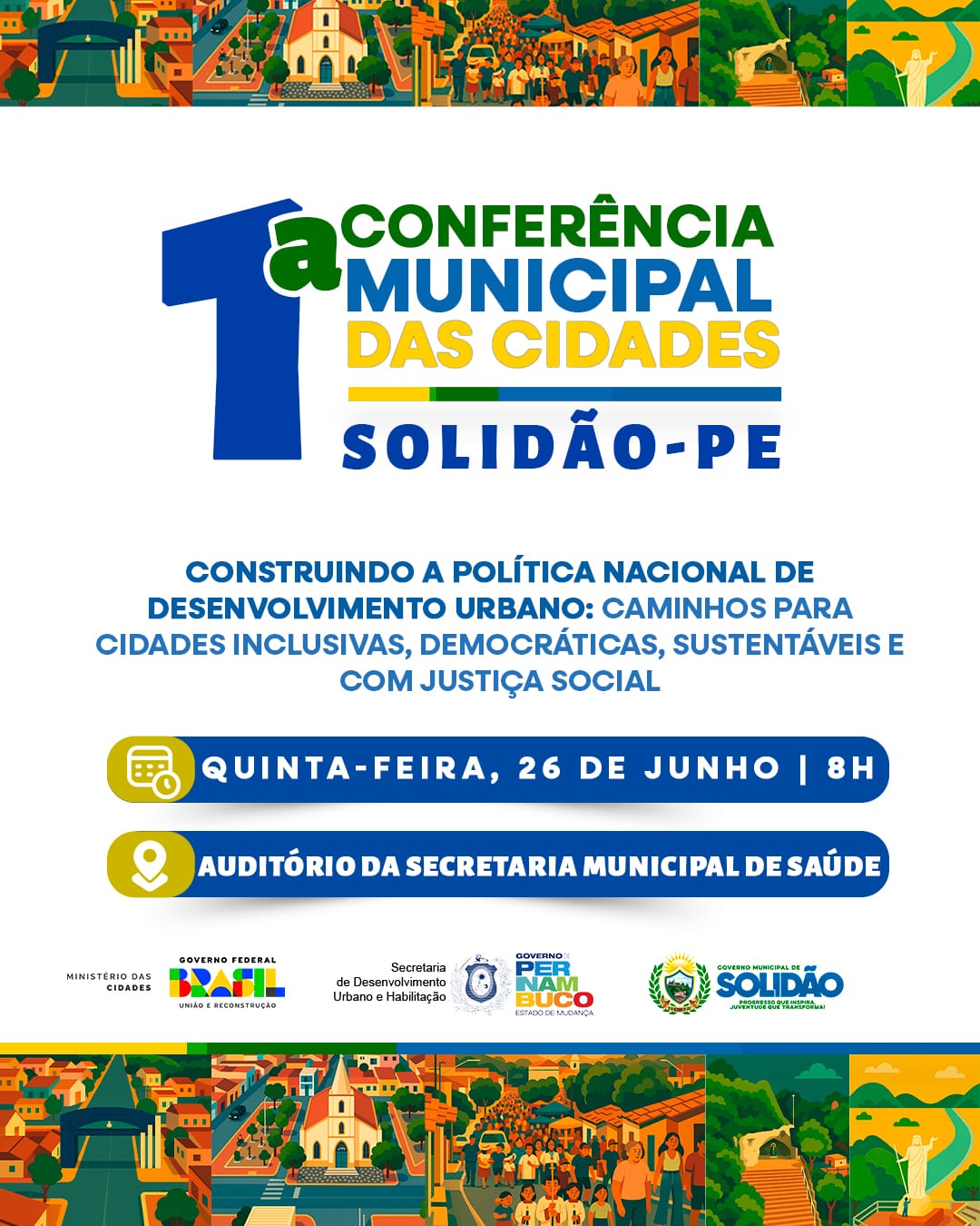 A 1ª Conferência Municipal das Cidades de Solidão-PE será realizada na próxima quinta-feira, 26 de junho, às 8h, no auditório da Secretaria Municipal de Saúde. Com o tema “Construindo a Política Nacional de Desenvolvimento Urbano: caminhos para cidades inclusivas, democráticas, sustentáveis e com justiça social”, o encontro busca promover o diálogo e a participação popular