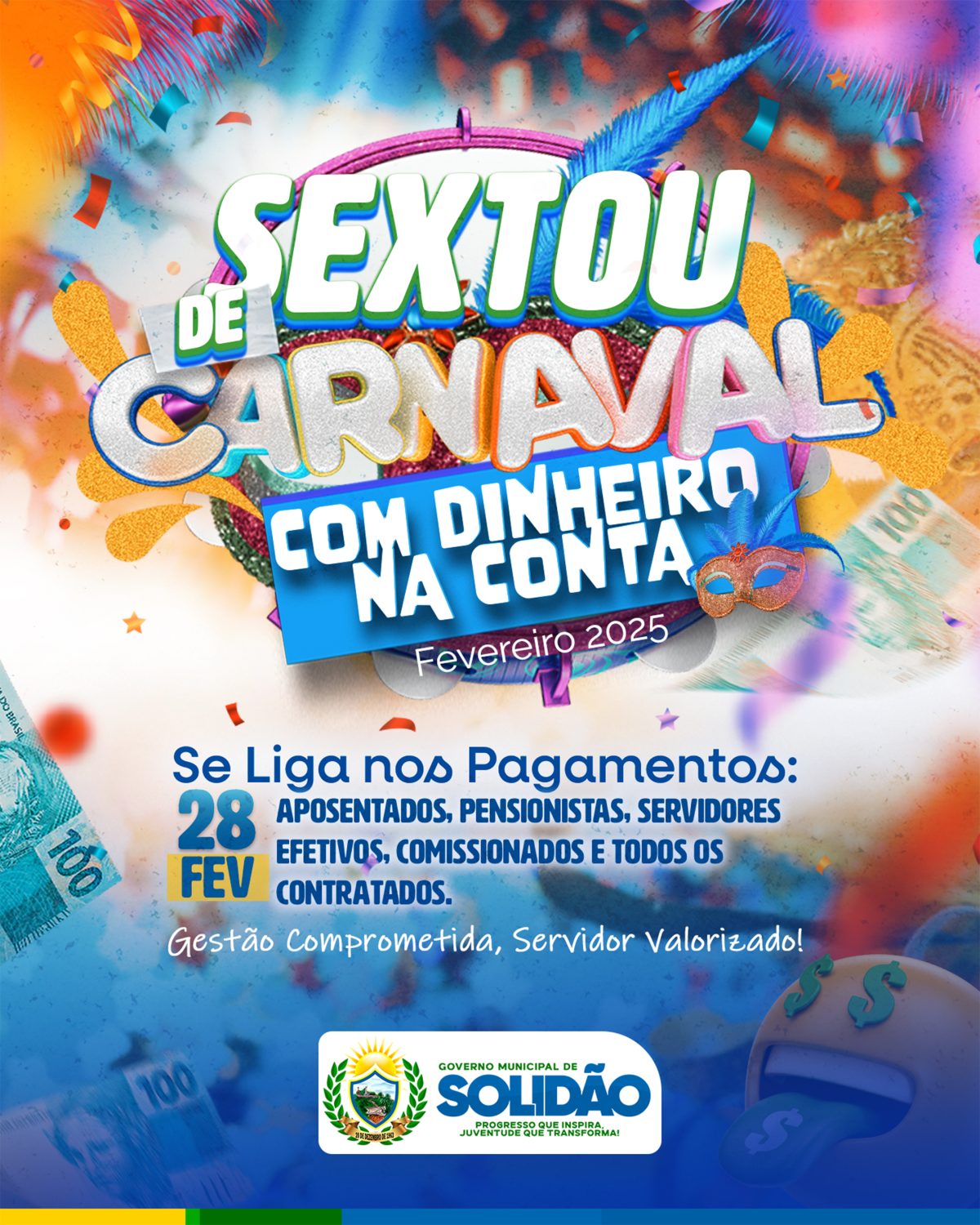 O Governo Municipal de Solidão anunciou o calendário de pagamento dos servidores para o mês de fevereiro. Os salários serão depositados nesta sexta-feira, dia 28, beneficiando aposentados, pensionistas, servidores efetivos, comissionados e todos os contratados. Com a divulgação do cronograma, a gestão reforça seu compromisso com a valorização dos servidores e a organização financeira do