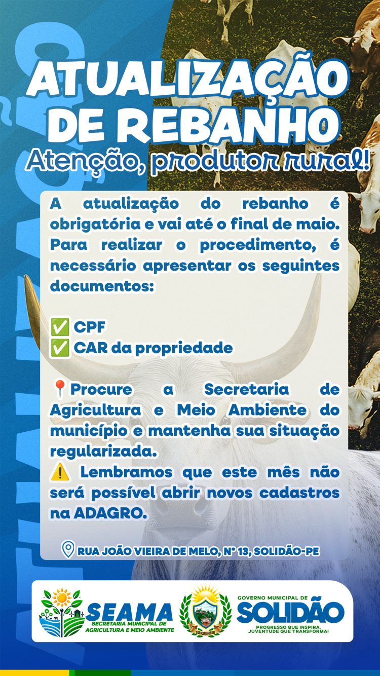 A Prefeitura Municipal de Solidão, por meio da Secretaria de Agricultura e Meio Ambiente (SEAMA), informa que está em andamento o processo obrigatório de atualização de rebanho. O prazo se estende até o final de maio, e é essencial para todos os produtores rurais manterem suas informações atualizadas junto aos órgãos competentes. Para realizar a