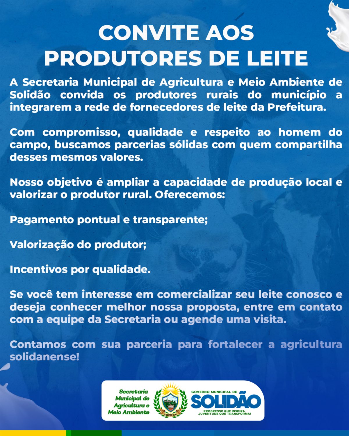 A Prefeitura de Solidão, por meio da Secretaria de Agricultura e Meio Ambiente, convida os produtores de leite do município para integrar a nova rede de fornecedores de leite da gestão municipal. A ação visa fortalecer a produção local e gerar mais renda no campo, com parcerias baseadas no compromisso, na transparência e no respeito
