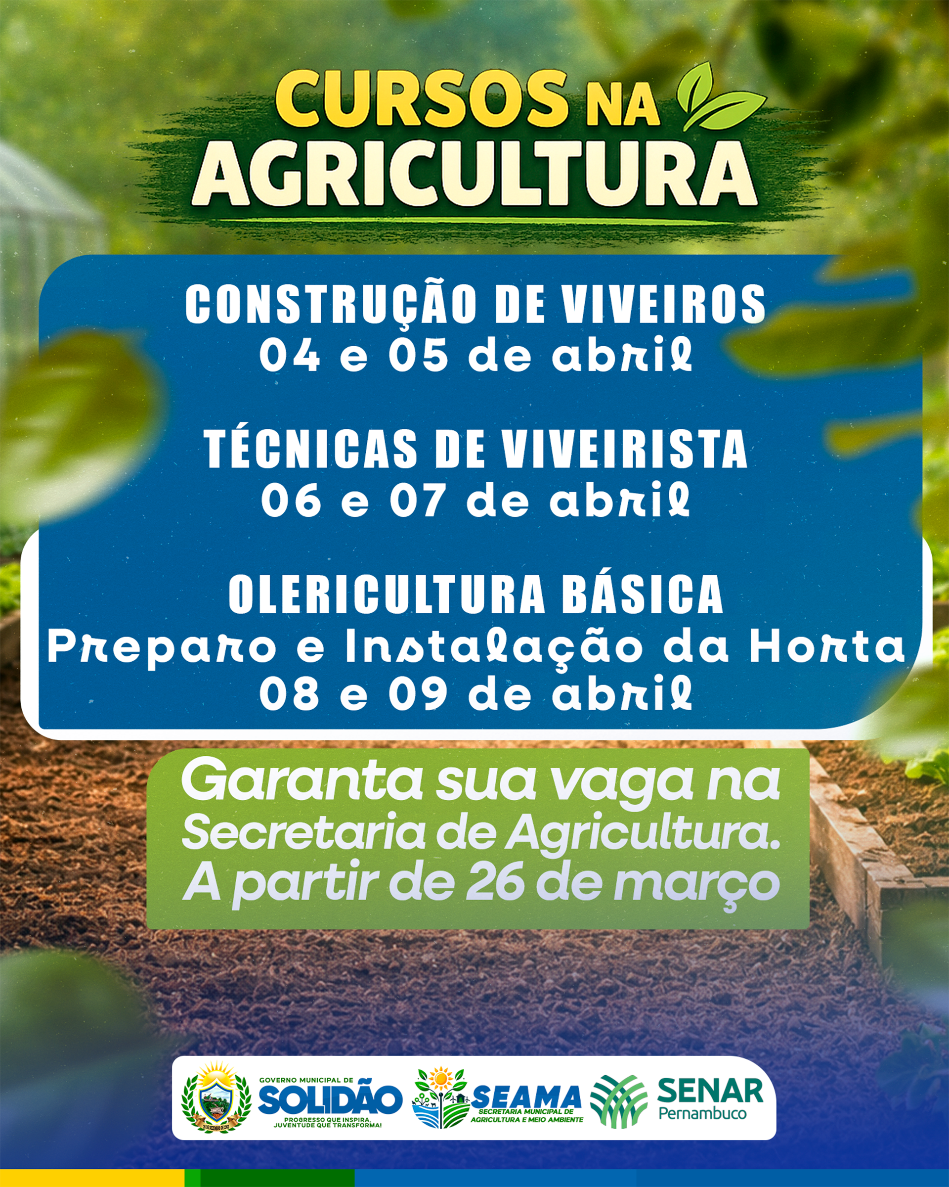 A Prefeitura de Solidão, por meio da Secretaria de Agricultura e Meio Ambiente e em parceria com o Serviço Nacional de Aprendizagem Rural (SENAR-PE), realizará uma série de cursos voltados ao fortalecimento da agricultura local. A iniciativa tem como objetivo capacitar produtores rurais e demais interessados, promovendo qualificação técnica, incentivo à geração de renda e