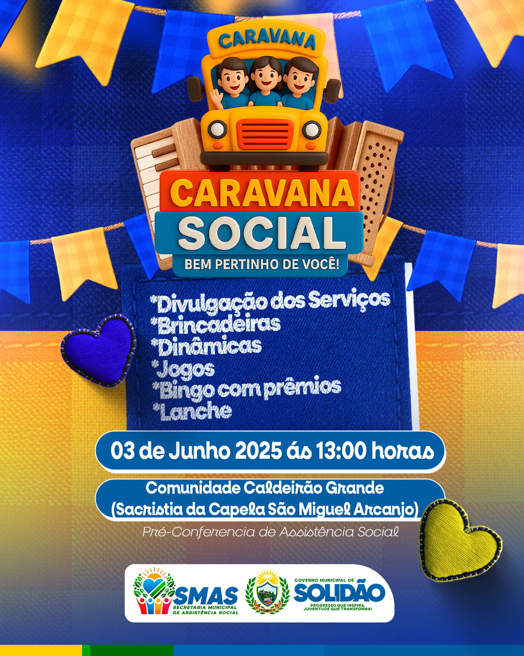 A Prefeitura Municipal de Solidão, por meio da Secretaria de Assistência Social, vai realizar a Caravana Social “Bem Pertinho de Você”, uma ação itinerante que percorrerá comunidades e distritos com serviços, atendimentos e atividades voltadas à população. Confira as programações que serão partir das 13h00: 03 de junho – Comunidade Caldeirão Grande (Sacristia da Capela São