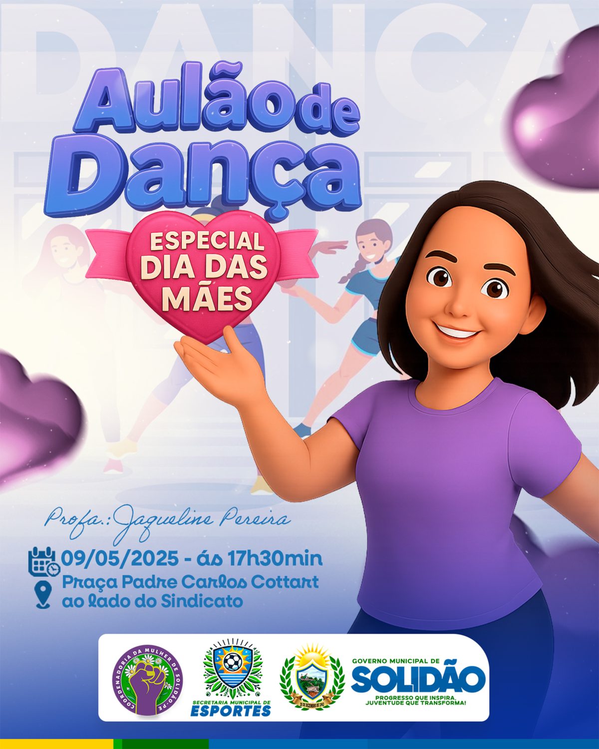 Em comemoração ao Dia das Mães, a Prefeitura Municipal de Solidão, por meio da Coordenadoria da Mulher e da Secretaria Municipal de Esportes, convida todas as mães e mulheres solidanenses para participarem de uma aula de dança gratuita e especial, nesta sexta-feira (09/05), às 17h30, na Praça Padre Carlos Cottart (ao lado do sindicato). A atividade será conduzida pela professora Jaqueline Pereira, conhecida por