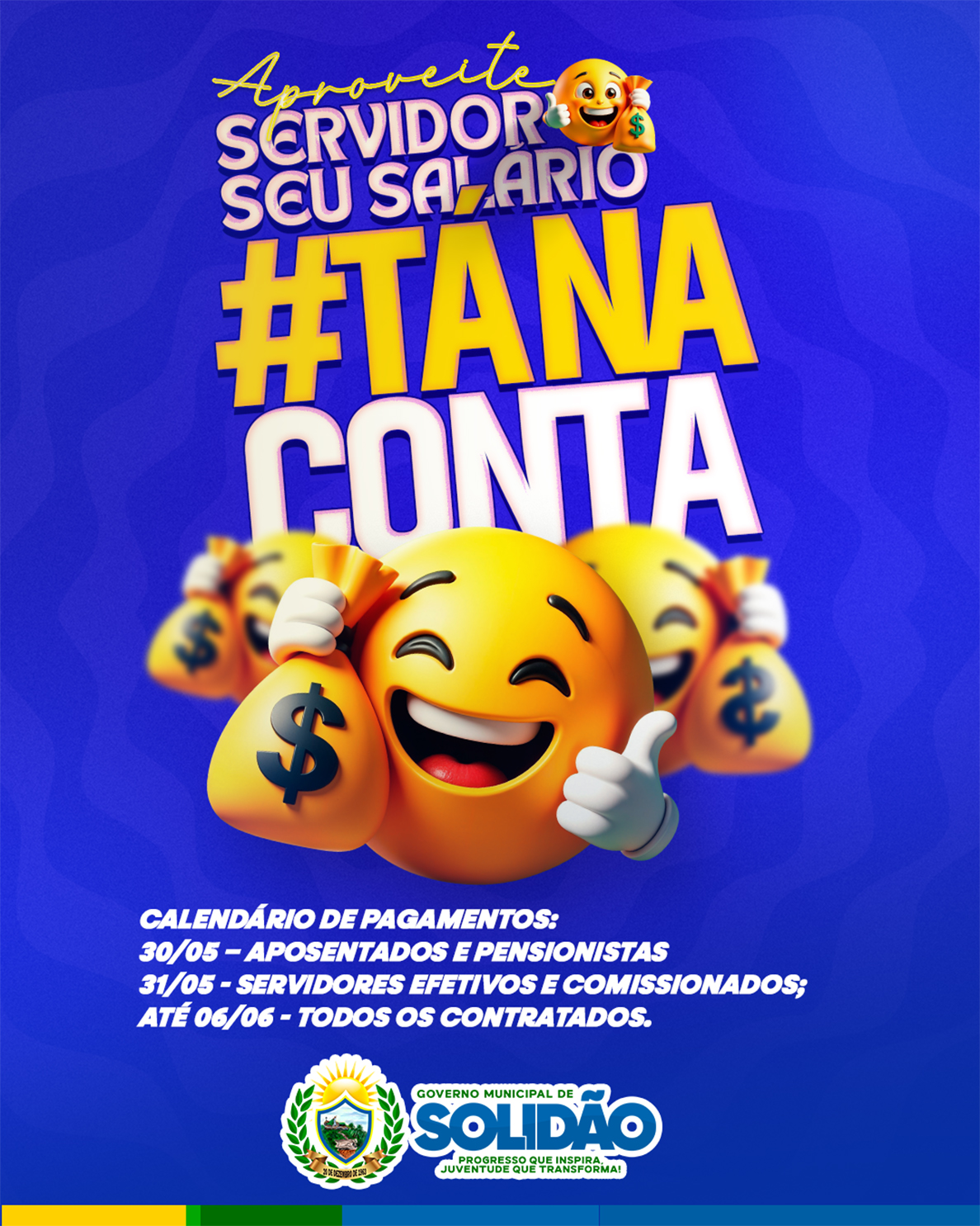 A Prefeitura Municipal de Solidão anunciou nesta segunda-feira, 30 de junho, o pagamento dos salários referentes ao mês de junho. A medida beneficia aposentados, pensionistas, servidores efetivos e comissionados, que terão os valores depositados já no dia 30 de junho. Os servidores contratados também serão contemplados até o dia 4 de julho. A ação reforça
