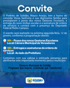A Prefeitura de Solidão realiza na próxima segunda-feira, 12 de janeiro de 2026, uma programação especial que marca importantes avanços para a cidade. O evento é promovido pelo Governo Municipal e contará com a posse dos novos gestores escolares, acompanhado da entrega de um novo ônibus escolar e assinatura de ordens de serviços, reforçando o compromisso com a educação e o desenvolvimento local.