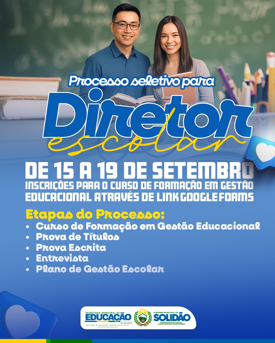 A Prefeitura de Solidão, por meio das Secretarias de Educação e Administração, anuncia a abertura do Processo Seletivo nº. 003/2025, destinado ao preenchimento do cargo/função de Diretor (a) Escolar das unidades de ensino da Rede Pública Municipal. A iniciativa reforça o compromisso da gestão com a valorização da educação e a busca pela qualidade do