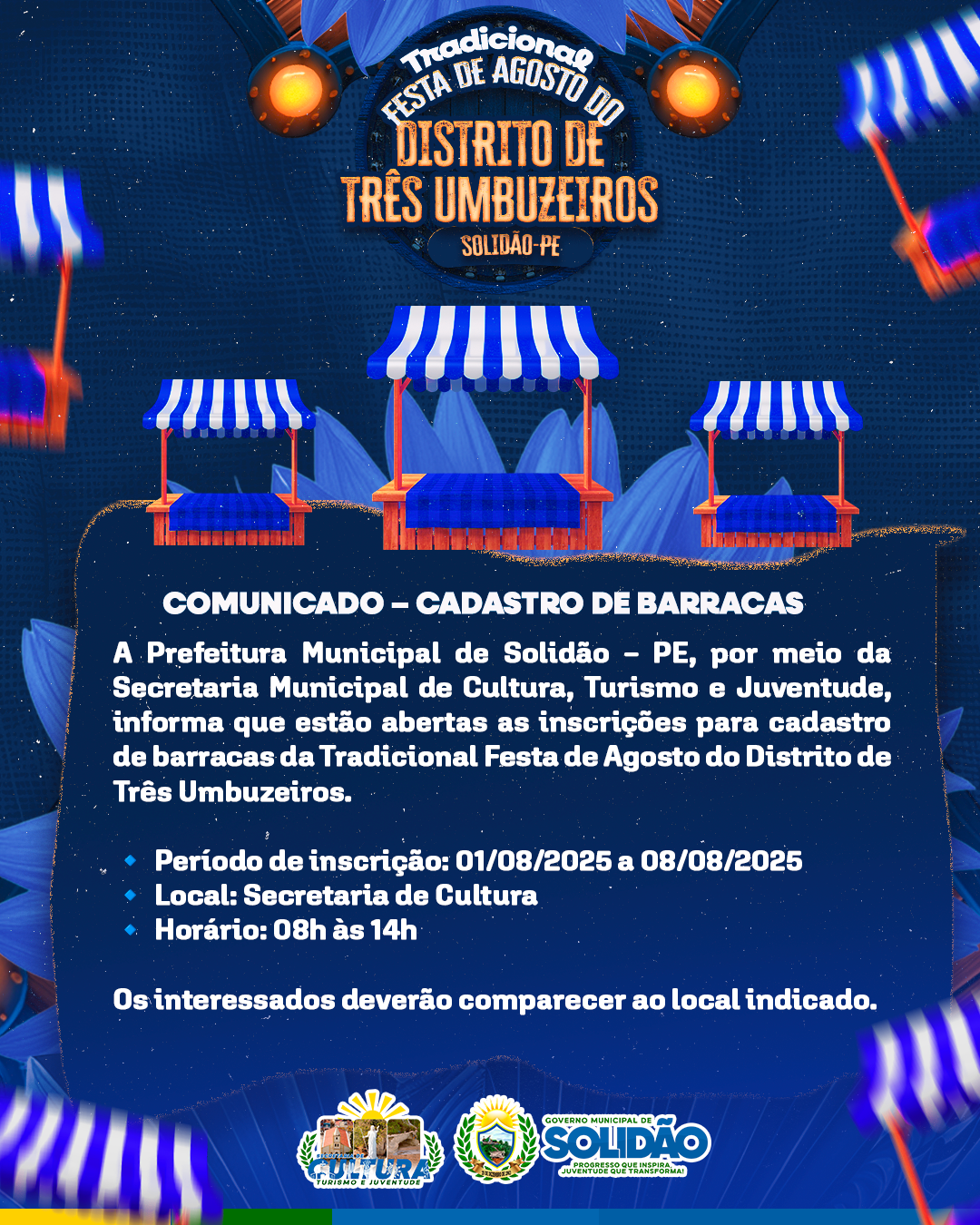 A Prefeitura Municipal de Solidão, por meio da Secretaria de Cultura, Turismo e Juventude, anunciou a abertura das inscrições para o cadastro de barracas da Tradicional Festa de Agosto do Distrito de Três Umbuzeiros. O período de inscrição vai de 01 a 08 de agosto de 2025, das 08h às 14h, diretamente na sede da