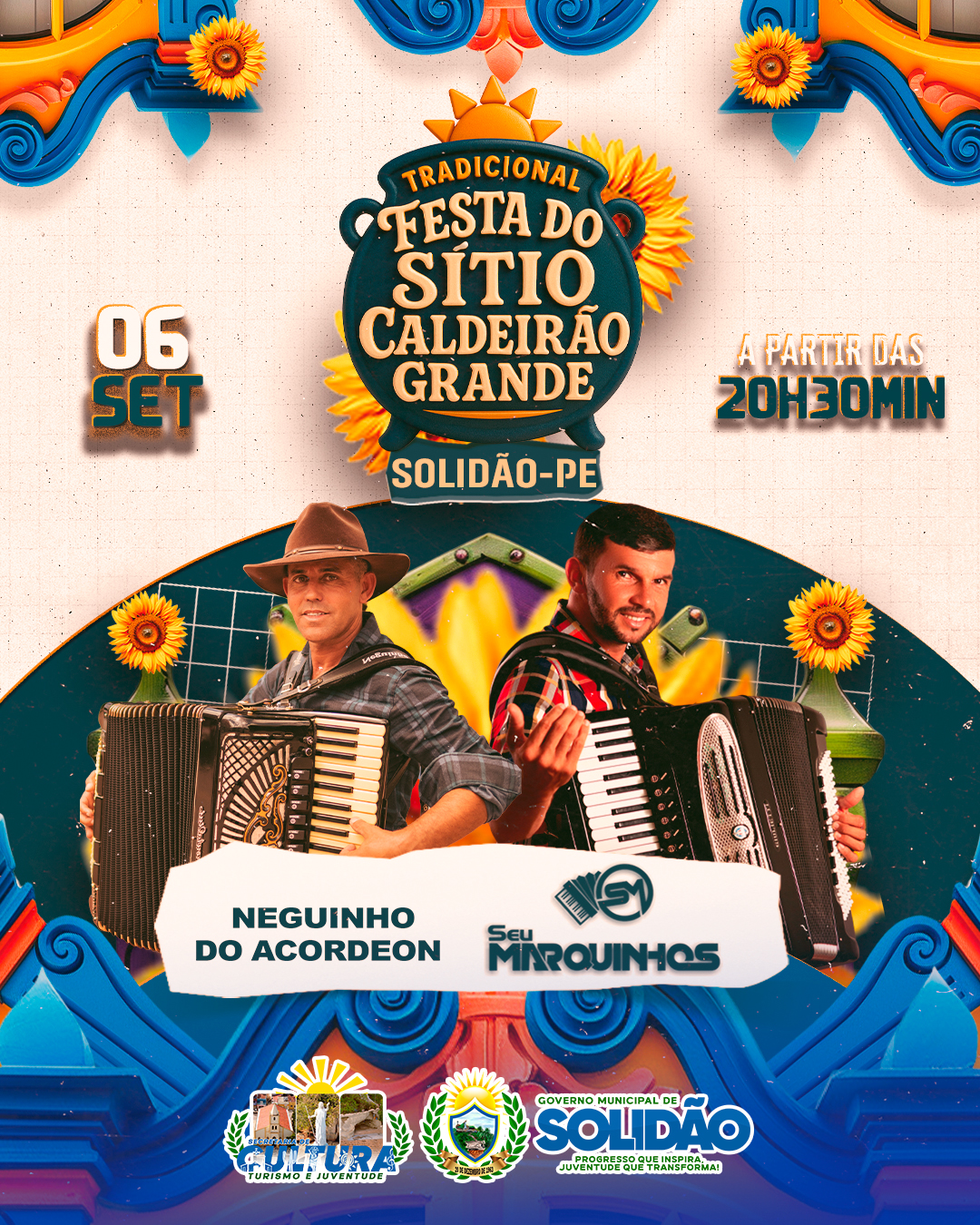 A Prefeitura Municipal de Solidão, por meio da Secretaria de Cultura, Turismo e Juventude, anuncia a realização da Tradicional Festa de Setembro do Sítio Caldeirão Grande, que acontecerá no próximo dia 6 de setembro, a partir das 20h30min, no sítio Caldeirão Grande, zona rural da cidade. Neste ano, a programação conta com shows de Neguinho do Acordeon e Seu Marquinhos, nomes