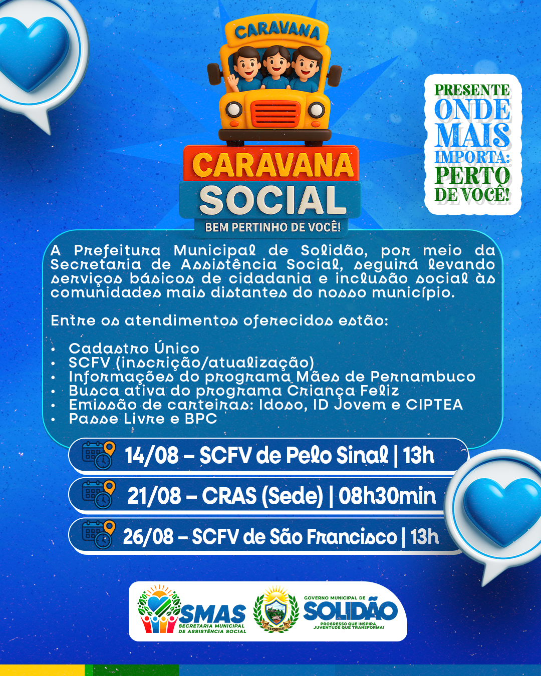 A Prefeitura de Solidão, por meio da Secretaria de Assistência Social, realizará neste mês de agosto mais uma edição da “Caravana Social – Bem pertinho de você!”, com o objetivo de descentralizar e facilitar o acesso da população a serviços essenciais de cidadania e inclusão social. A ação acontecerá em três datas e localidades distintas: