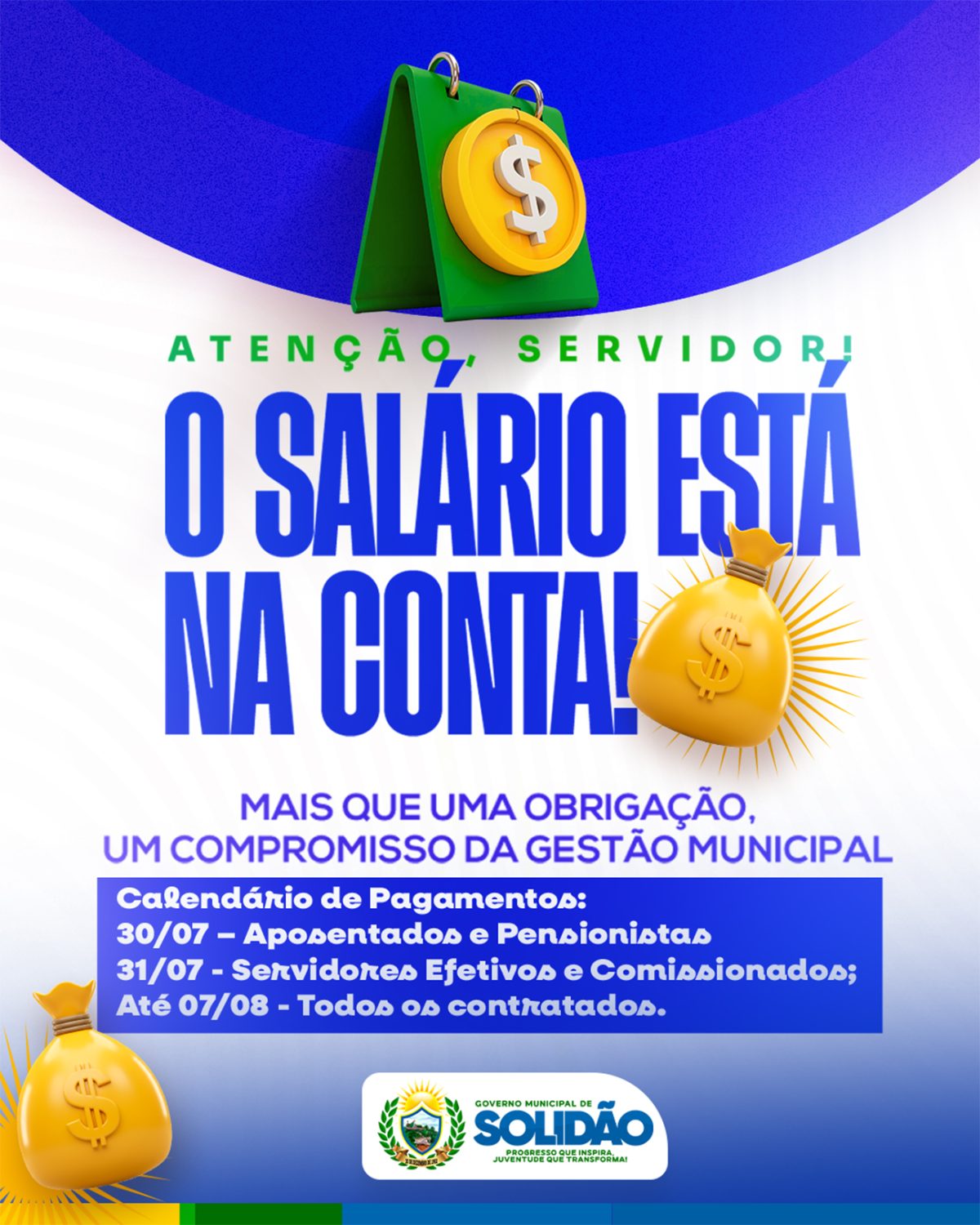 A Prefeitura Municipal de Solidão iniciou nesta quarta-feira (30), o pagamento dos salários dos servidores públicos referente ao mês de julho de 2025. De acordo com o calendário divulgado, o processo será realizado de forma escalonada, contemplando todos os vínculos funcionais da administração pública. No dia 30 de julho, receberam os aposentados e pensionistas. Já os servidores