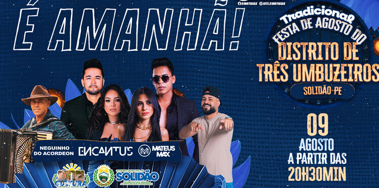 A tradicional Festa de Agosto do Distrito de Três Umbuzeiros, em Solidão-PE, acontece amanhã, sábado (09), a partir das 20h30min, com uma programação musical especial que promete animar a noite da comunidade e visitantes. Estarão no palco a Banda Encantu’s, Mateus Max e Neguinho do Acordeon, garantindo uma noite de muita música e alegria para