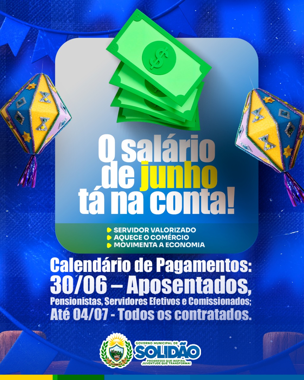 A Prefeitura Municipal de Solidão anunciou nesta segunda-feira, 30 de junho, o pagamento dos salários referentes ao mês de junho. A medida beneficia aposentados, pensionistas, servidores efetivos e comissionados, que terão os valores depositados já no dia 30 de junho. Os servidores contratados também serão contemplados até o dia 4 de julho. A ação reforça