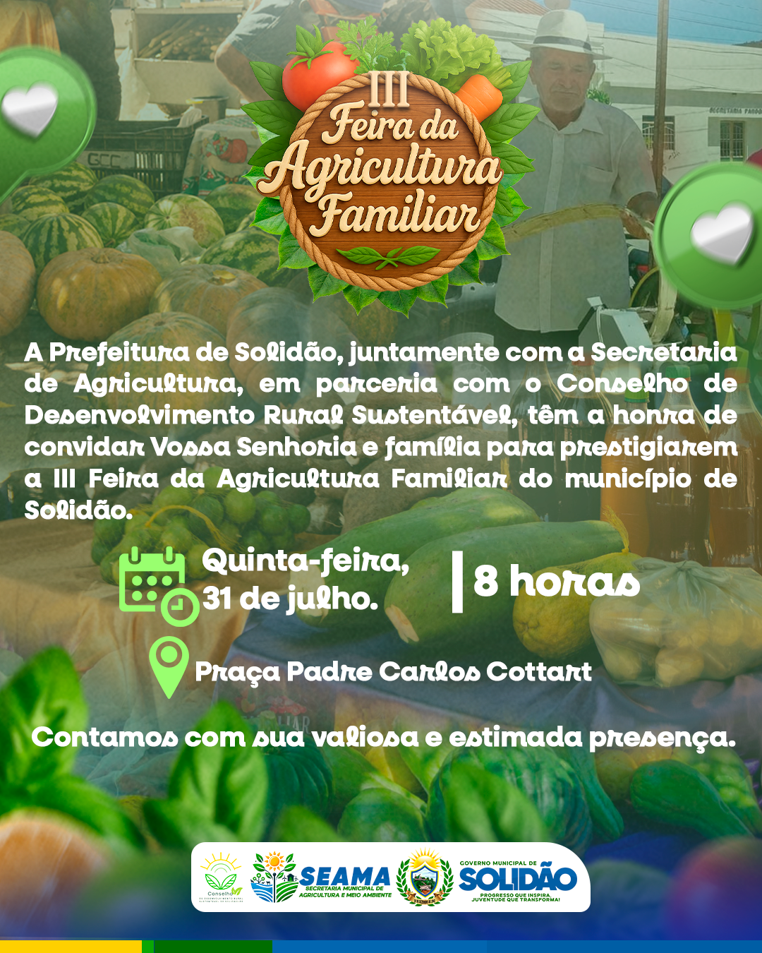 A cidade de Solidão será palco de mais uma grande celebração do homem e da mulher do campo. A Feira da Agricultura Familiar acontecerá na próxima quinta-feira, 31 de julho, a partir das 8h da manhã, na Praça Padre Carlos Cottart. O evento promete movimentar o centro da cidade com uma programação especial voltada para