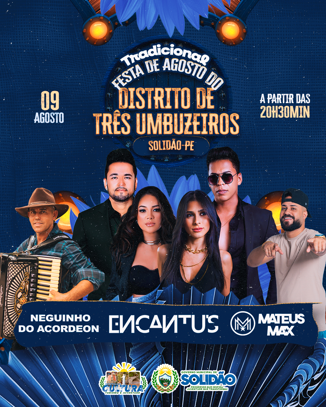 A Prefeitura de Solidão, através da Secretaria de Cultura, Turismo e Juventude, divulgou oficialmente as atrações da Tradicional Festa de Agosto do Distrito de Três Umbuzeiros. O evento acontecerá no dia 09 de agosto, a partir das 20h30min, e promete movimentar a região com uma grande programação musical e cultural. Entre os destaques está a