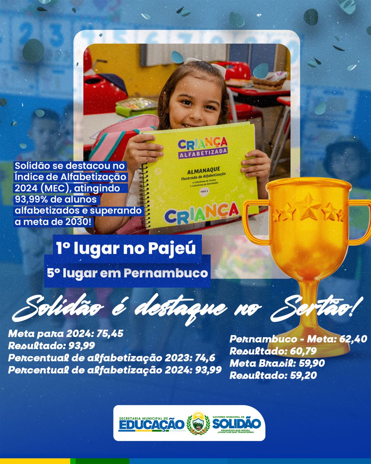 O município de Solidão, no Sertão do Pajeú, conquistou um marco histórico na educação pública: 1º lugar entre as cidades do Pajeú e 5º lugar em todo o estado de Pernambuco nos índices de alfabetização da rede municipal de ensino. Em 2024, 93,99% das crianças do 2º ano foram alfabetizadas na idade certa, superando com