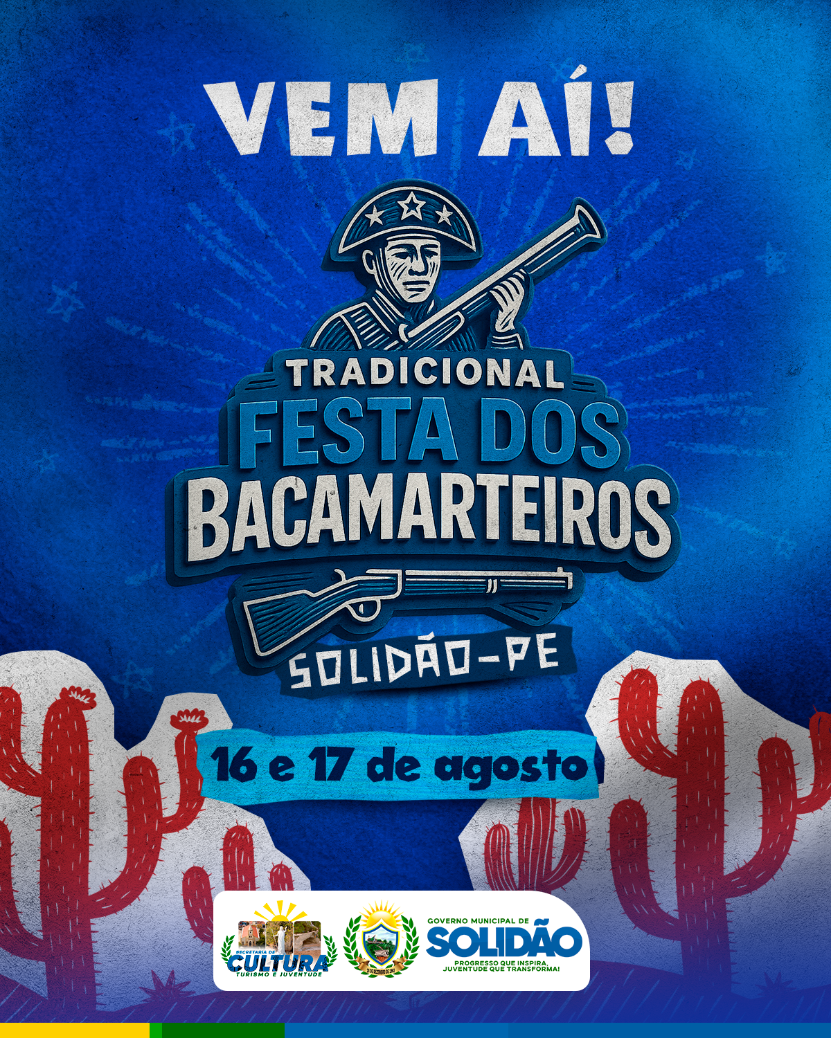 A Prefeitura de Solidão-PE, por meio da Secretaria de Cultura, Turismo e Juventude, anuncia a chegada de mais uma edição da Tradicional Festa dos Bacamarteiros, que acontecerá nos dias 16 e 17 de agosto. O evento é um dos mais esperados do calendário cultural do município e celebra a força das tradições nordestinas. Com identidade visual