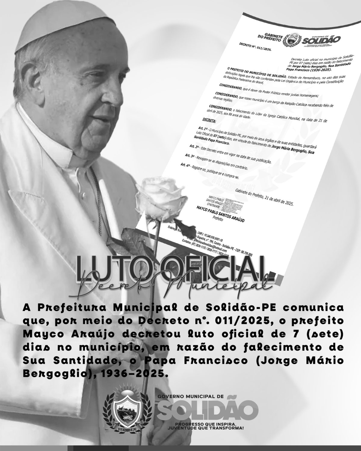 O município de Solidão, no Sertão de Pernambuco, decretou oficialmente luto de 7 (sete) dias em razão do falecimento de Jorge Mário Bergoglio, Sua Santidade Papa Francisco, aos 88 anos de idade. O Decreto, de número 011/2025, foi publicado pelo prefeito Mayco Pablo Santos Araújo. Sendo a cidade de Solidão reconhecida como berço de fé