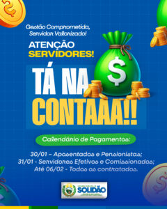 O Governo de Solidão efetuou o pagamento dos servidores públicos referente ao mês de janeiro de 2026, cumprindo rigorosamente o calendário financeiro previamente divulgado.