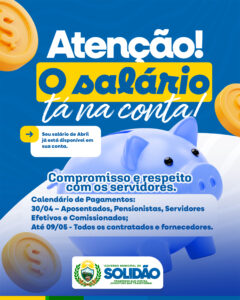 A Prefeitura de Solidão anunciou nesta quarta-feira (30), a liberação dos salários referentes ao mês de abril para aposentados, pensionistas, servidores efetivos e comissionados. Os pagamentos já estão disponíveis nas contas bancárias dos servidores, evidenciando o compromisso da gestão municipal com a valorização do funcionalismo público.